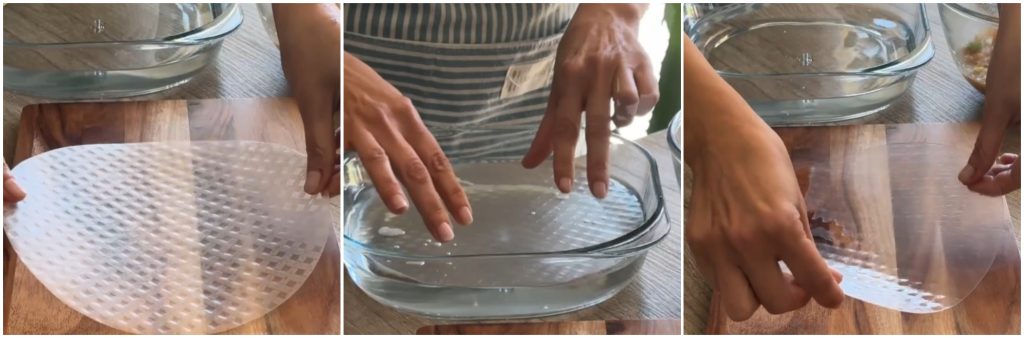 Take one sheet of rice paper at a time, immerse it completely in a bowl filled with cold water, being careful not to break it.