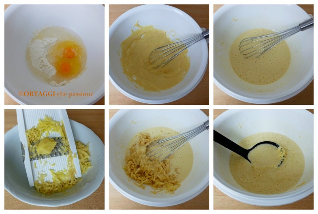 In a bowl, pour the flour, eggs, salt, and 100 g of the total water to dissolve everything. Mix well with a whisk and add the remaining water to get a smooth, lump-free batter. Finally, add the grated potatoes.