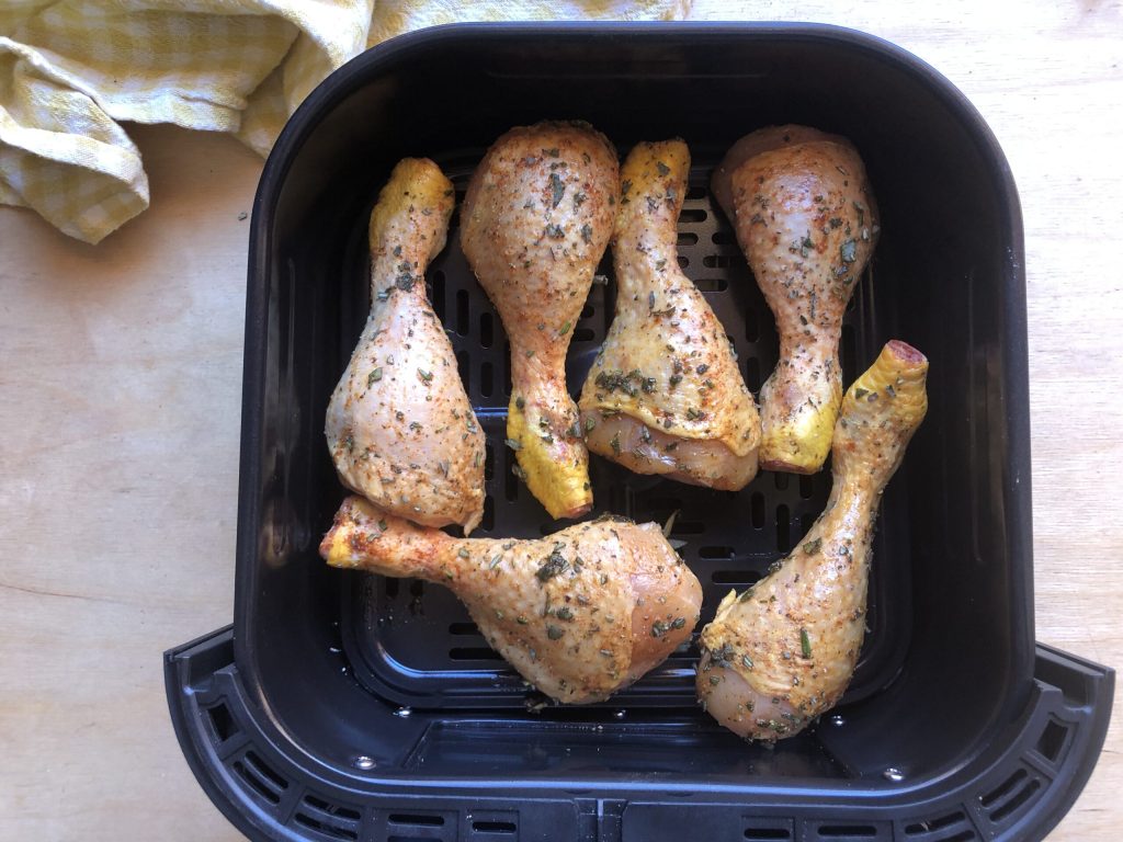 After the marination time, transfer the chicken drumsticks to the basket of a preheated air fryer (naturally, if your air fryer has this option) without overlapping them. If you decide to use parchment paper, remember to poke holes in it to allow proper air circulation or use pre-perforated sheets.