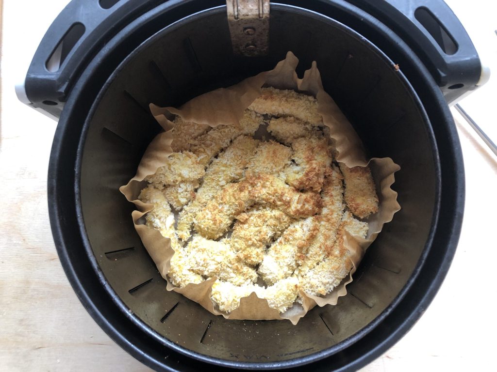 Cook the chicken nuggets in the air fryer at 356°F for 20/25 minutes, turning them halfway through with tongs.