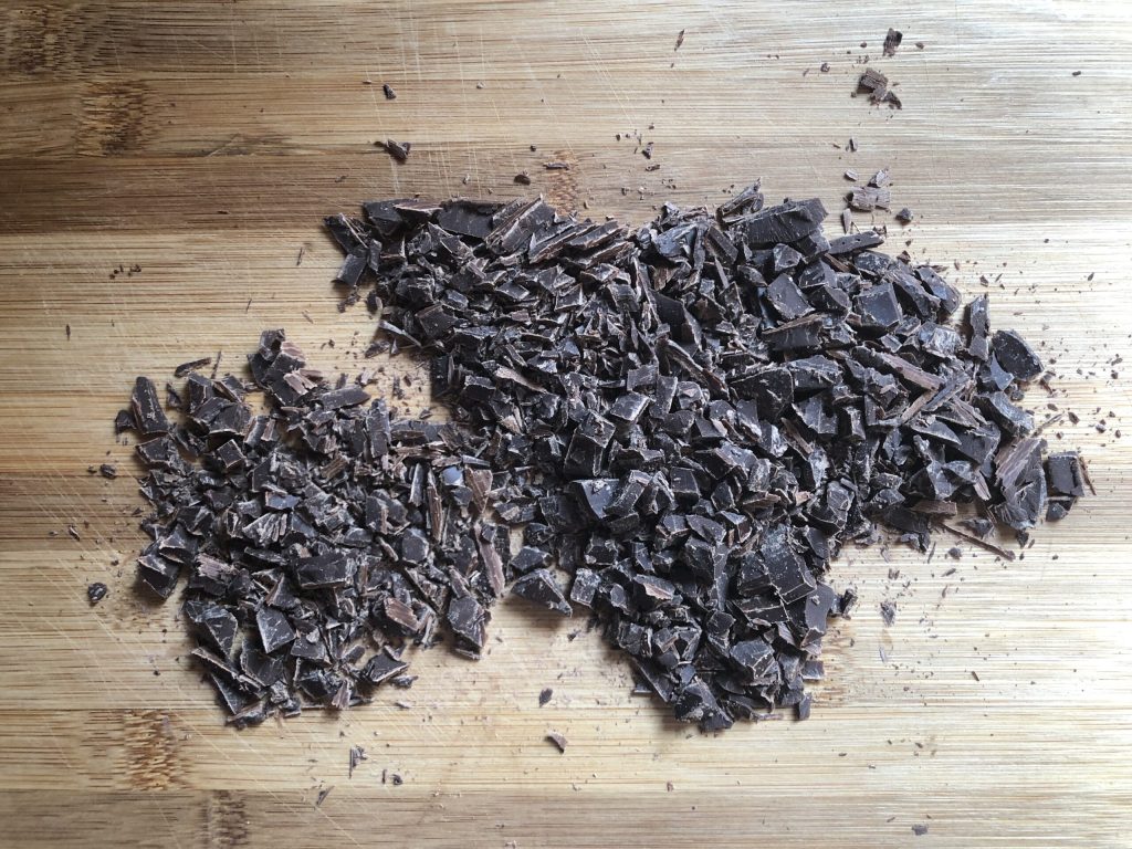 With a knife, coarsely chop the dark chocolate. If you prefer, you can use chocolate chips.