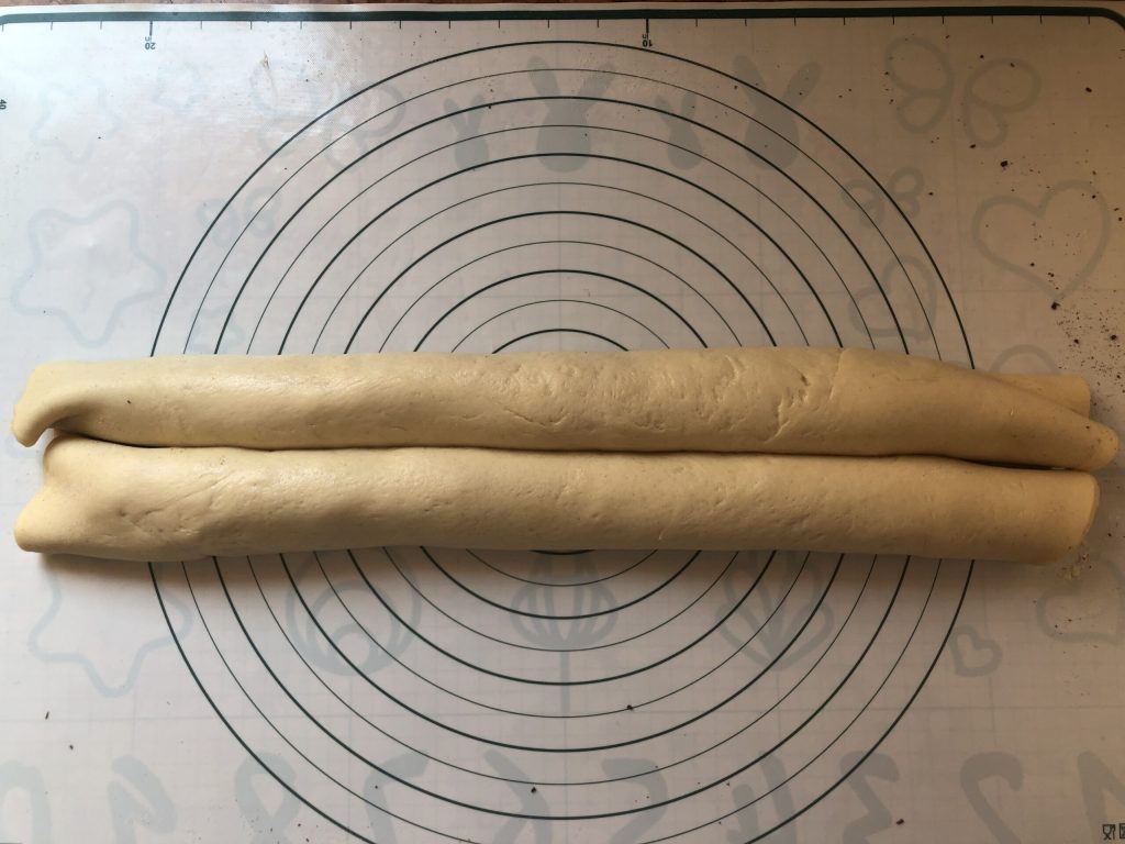 At the end of the rising, transfer the dough onto a lightly floured work surface and roll it out with a rolling pin to form a rectangle: mine measured 18 x 14 inches.