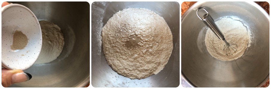 Sift the flour into the bowl of the stand mixer, add the yeast and mix with a small hand whisk. If you are using fresh brewer’s yeast, dissolve it in lukewarm water before adding it to the flour.