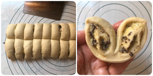Cut the obtained double roll into slices about 1 to 1.25 inches thick. Take each piece in your hand and fold it upwards to form a sort of fan.