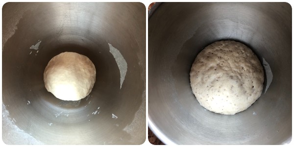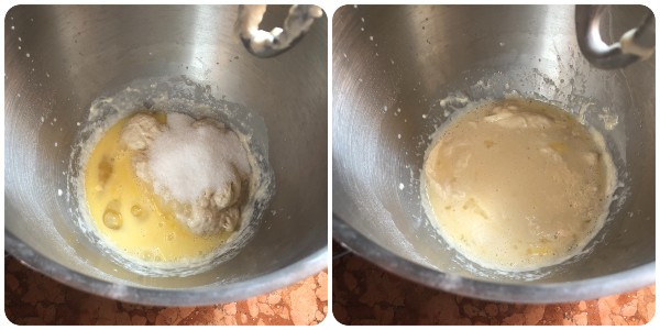 Then add them to the dough along with the remaining sugar and continue kneading with the dough hook.