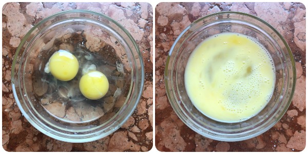 Crack the two eggs into a small bowl and beat them lightly with a fork.