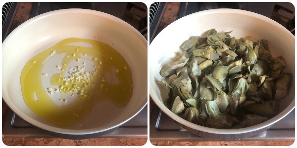Meanwhile, peel the garlic, remove the central core, and finely chop it. Then sauté it in a few tablespoons of oil inside a large pan. If you don’t like it, you can keep the clove whole and remove it at the end of cooking. Let it sizzle for a few moments, then add the well-drained artichoke hearts.