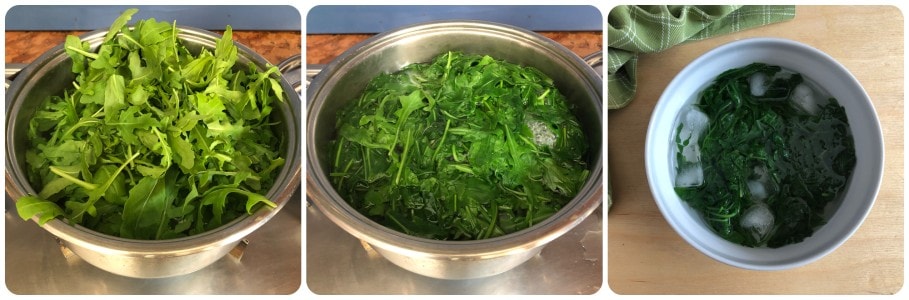 Wash the arugula very well, then blanch it for a few seconds in salted boiling water, then drain it and immediately transfer it to a bowl full of ice water.