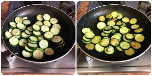 In a pan, heat a few tablespoons of oil and brown the crushed or halved garlic clove. Add the zucchini, a pinch of salt, a grind of black pepper, and cook them for about ten minutes.