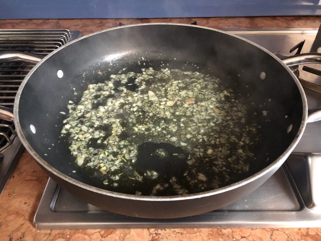 • In a large pan, heat a few tablespoons of oil, then add the garlic and shallot paste and a pinch of chili pepper, if desired. Pour in half a ladle of hot broth so it doesn’t burn.
