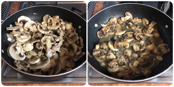 In a large pan, heat a few tablespoons of oil and fry the finely chopped shallot. Let it sizzle for a moment, then add the mushrooms. Salt and pepper to taste and cook for about ten minutes, stirring occasionally.