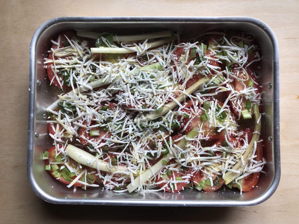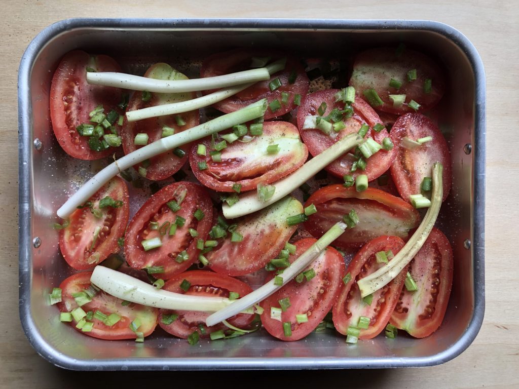 Grease a baking tray with a drizzle of oil and place the tomatoes with the cut side up. Add the scallions and the cut stems, then salt and pepper to taste.
