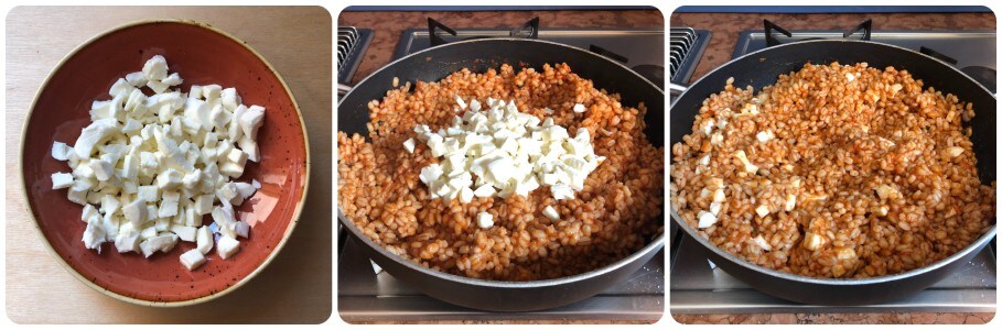 Cut the mozzarella into pieces, add it to the other ingredients, and continue cooking until the cheese melts.