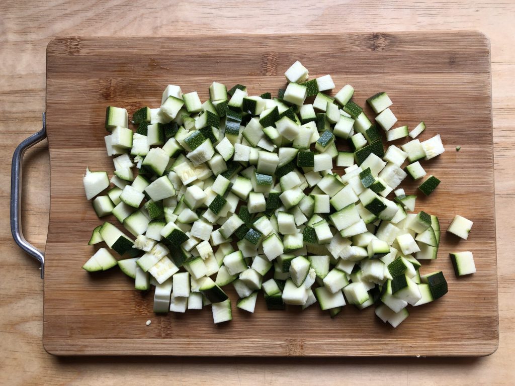 Trim the zucchini, wash them, pat them dry with kitchen paper and cut them into small pieces.