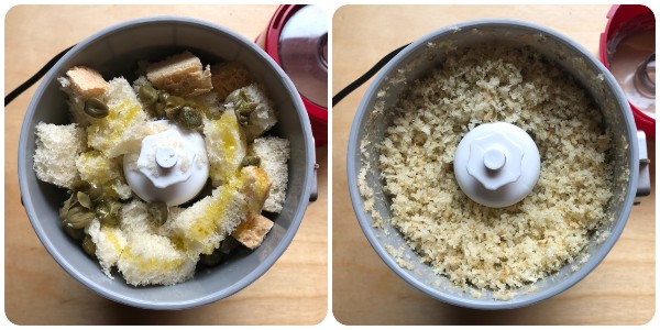 • Meanwhile, place the bread torn into pieces, the capers (rinsed and dried) and a drizzle of oil in a food processor and pulse coarsely.