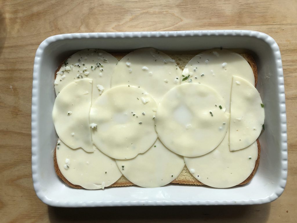 After this time, lightly butter a rectangular baking dish and arrange the bread slices to completely cover the bottom (trim them to size, if necessary). Again, have it sliced at purchase if not already sliced.
