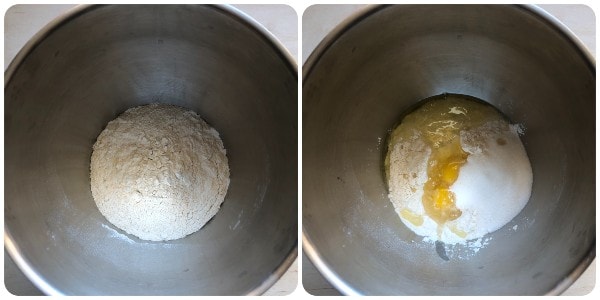 Pour the flour into the bowl of the stand mixer and add the eggs and the remaining sugar (1/4 cup).