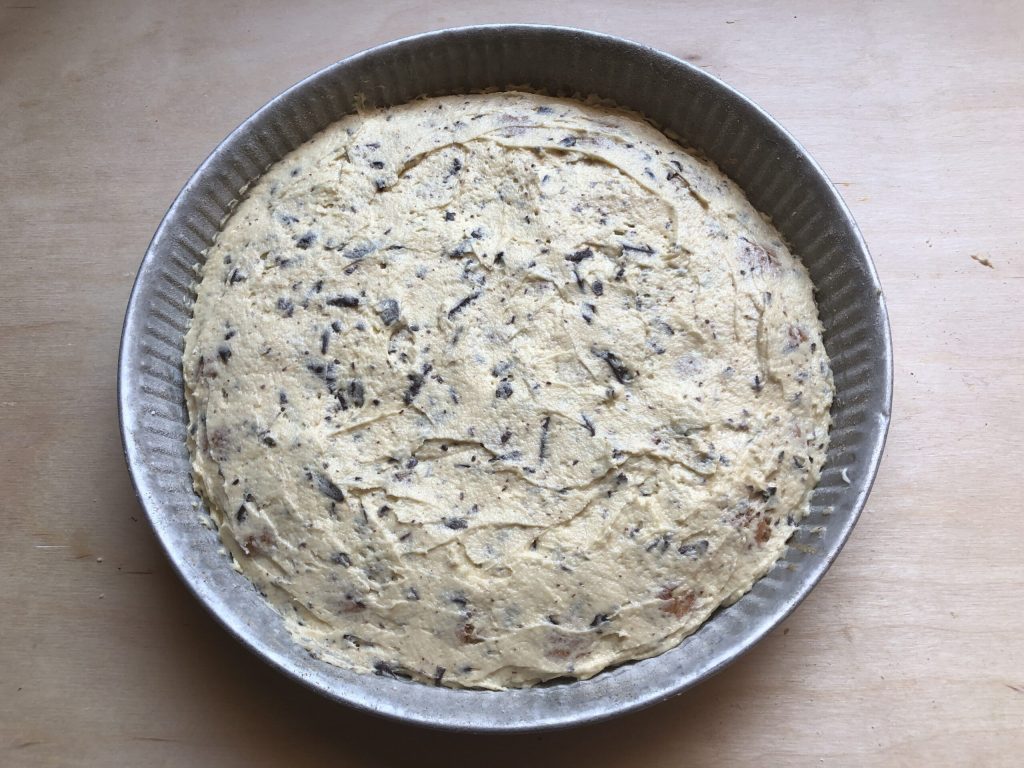 Now pour half of the mixture into a 10-inch diameter pan previously buttered and floured and level it well.