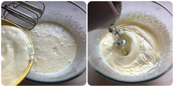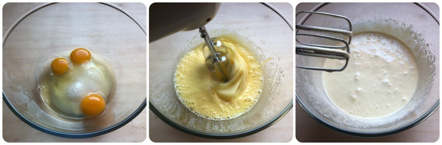 Crack the eggs into a large bowl, add the sugar, and whisk them with electric whisks until you get a light and fluffy mixture.