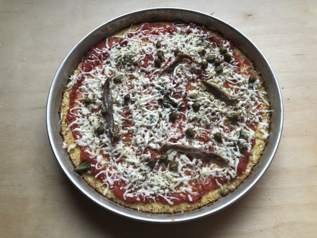 I topped this cauliflower pizza with capers and anchovies, but you can add your preferred ingredients on top of the tomato and mozzarella base.