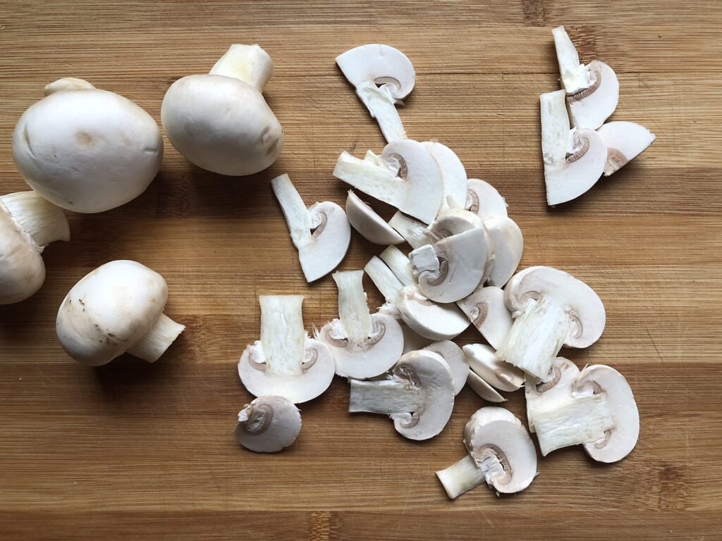 Clean the champignon mushrooms by removing the earthy base of the stem. Quickly rinse them under running water, pat them dry with paper towels, and slice them thinly.