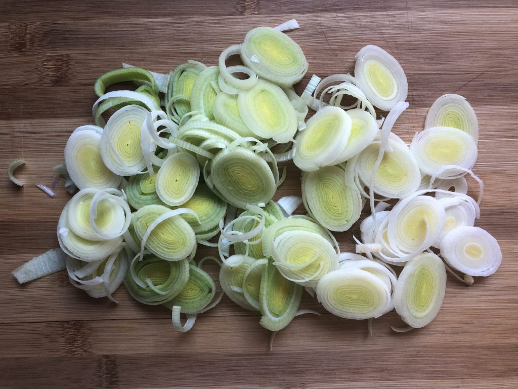 Clean the leek by removing the roots, the outer sheath, and the darker green part. Wash it well and cut it into rings.