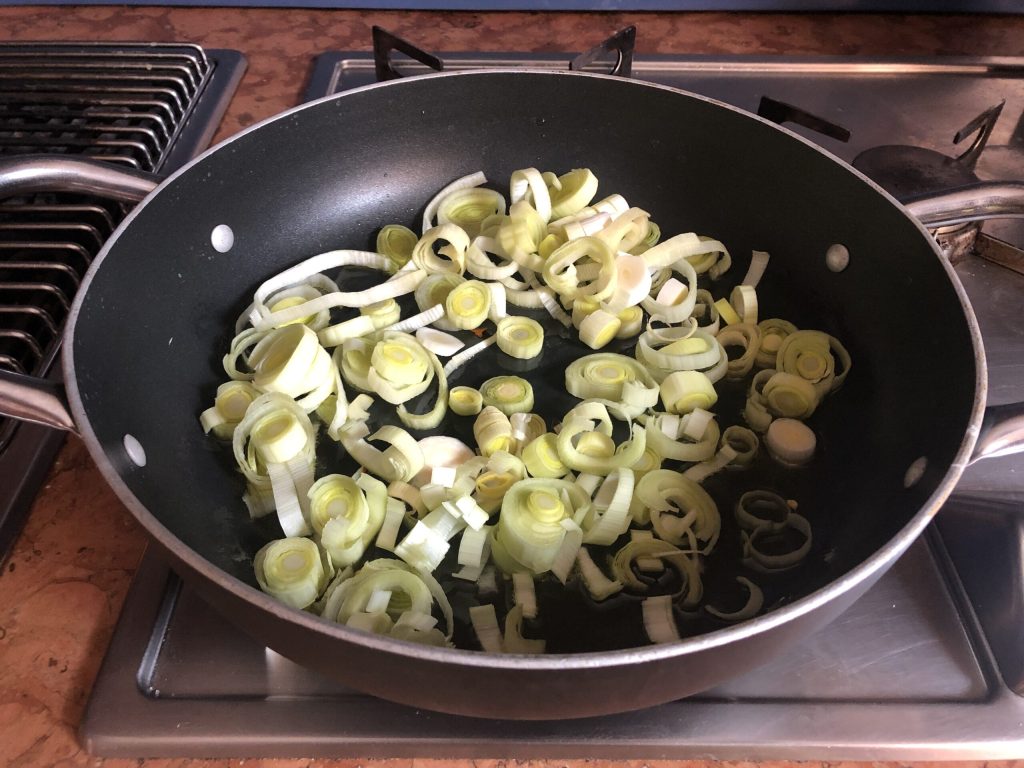 In a large pan, heat a few tablespoons of oil together with a pinch of chili pepper before adding the leeks and a couple of tablespoons of water. You can adjust the chili pepper to taste depending on personal preference.