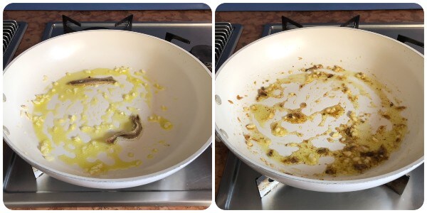 In a skillet, heat a drizzle of oil and sauté the finely chopped garlic. Add the anchovy fillets and let them melt by mashing them with the back of a spoon.