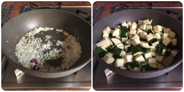 In a pan, melt the butter and sauté the finely chopped scallion. Then add the zucchini and stir-fry over medium heat for a minute, stirring constantly.
