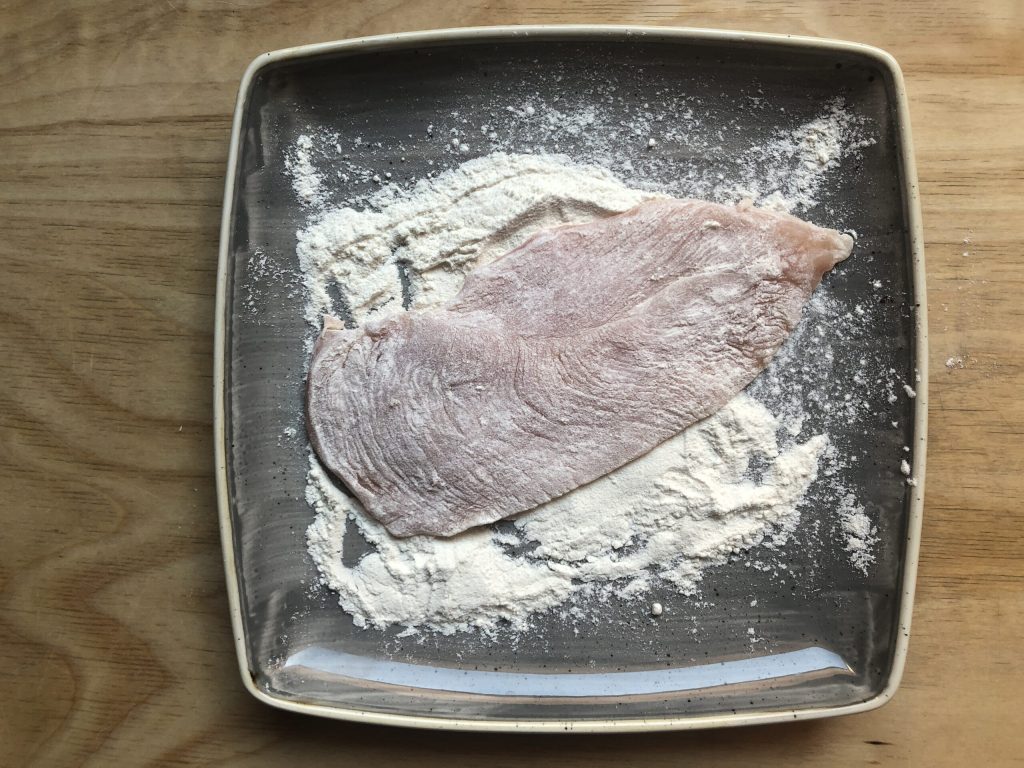 In a large pan, heat a few tablespoons of oil before adding the floured meat slices.