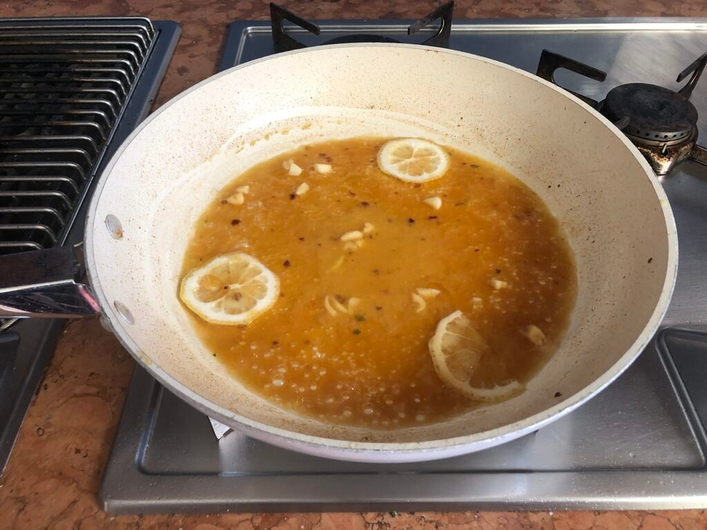 Add coarsely chopped garlic clove and chili flakes to taste to the drippings. Add white wine, hot broth, a couple of lemon slices, and let the sauce cook for a moment.