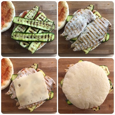 Now proceed with the FILLING: make a layer of grilled zucchini and lightly salt them, cover with 2 grilled chicken slices, and finally add a large slice of emmental cheese.