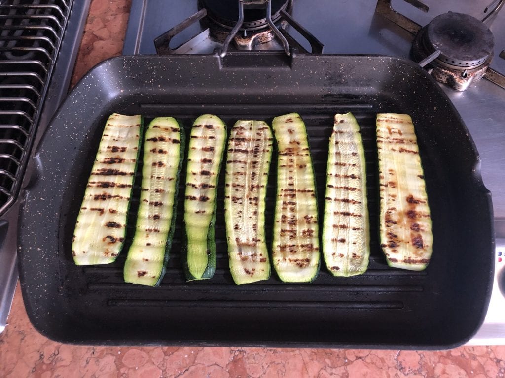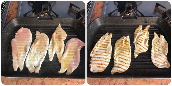 After the marinating time, drain the chicken breast slices and grill them on the same grill pan used for the zucchini.