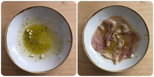 Pour a few tablespoons of oil into a deep plate, add a peeled and chopped clove of garlic, a pinch of salt, and a pinch of oregano. Mix, then marinate the chicken breast slices in it for at least fifteen minutes.