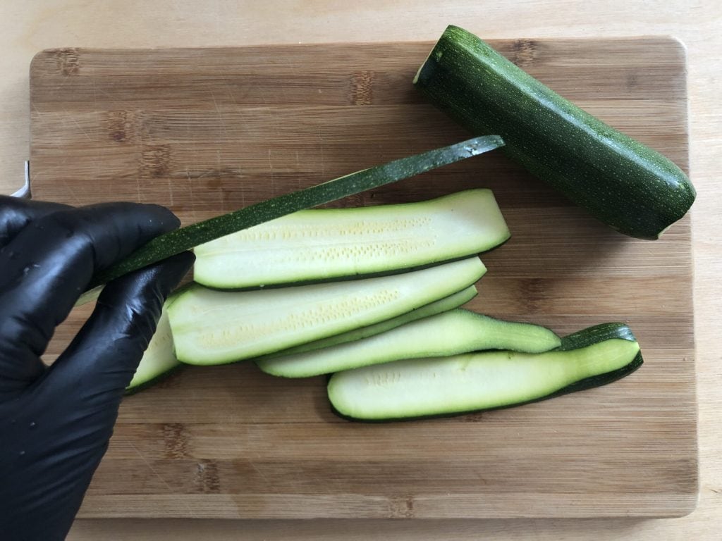 Meanwhile, trim the zucchini, wash them, and slice them lengthwise into not-too-thin slices. I recommend using a knife instead of a mandoline.