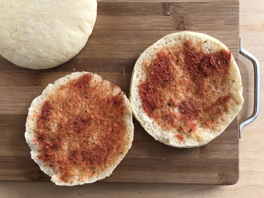 Close the chicken sandwich, brush the top with the leftover tomato sauce, and sprinkle with more oregano.