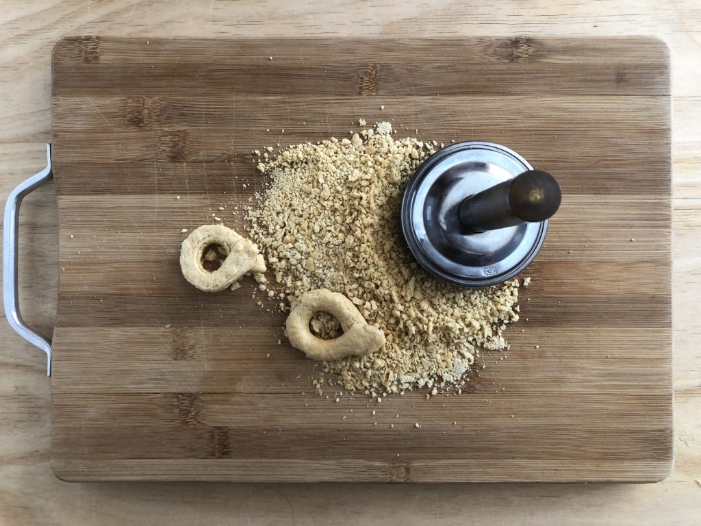 • Coarsely crumble the taralli (I used a meat tenderizer). If you prefer, you can substitute taralli with breadsticks or with toasted old bread.