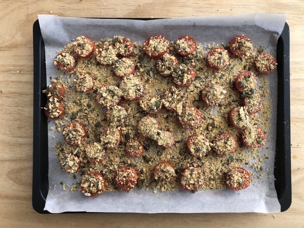 • Wash the cherry tomatoes, dry them, cut them in half and place them in a baking tray lined with parchment paper, cut side up. Salt and pepper them to taste.