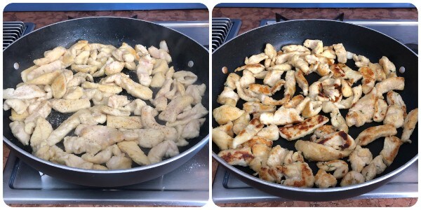 • In a large pan, heat a few tablespoons of olive oil and brown a peeled and halved clove of garlic. When it starts to sizzle, add the chicken strips and brown them well on both sides, stirring frequently.