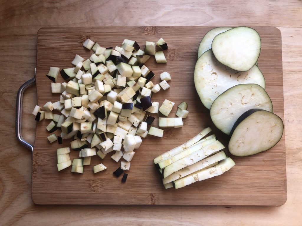 Trim the eggplant, wash it and slice it first into rounds, then into sticks and finally into cubes.