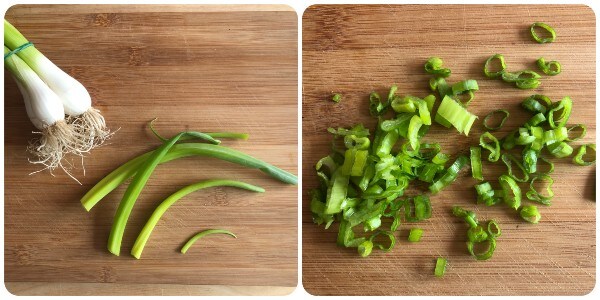 With scissors, cut a few green leaves of fresh green onion into rings.