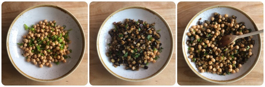 Appetizing and tantalizing, this chickpea and eggplant salad is exactly what you need when it’s hot and you don’t feel like eating elaborate dishes that require lengthy cooking. It’s very easy to prepare and also great as a take-away lunch. I loved it so much. Maybe because I adore chickpeas! Those little pointed spheres go well with everything and are nutritious and healthy.