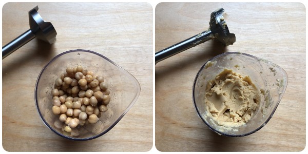 • Meanwhile, transfer the chickpeas into a hand blender container along with 20 ml (about 1.35 tbsps) of broth or water. If using water, add a pinch of salt. Blend until a firm and homogeneous mixture is obtained.