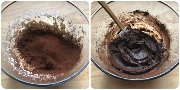 • Then add the unsweetened cocoa by sifting it through a fine mesh sieve and incorporate it into the mixture with a spatula.
