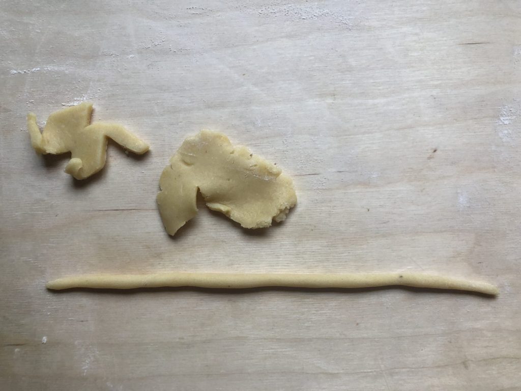 From the dough scraps, take 15 g of dough and form a cord about 10 inches long.