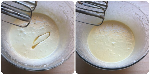 Then, add the oil by pouring it in a thin stream while continuing to use the electric beaters.