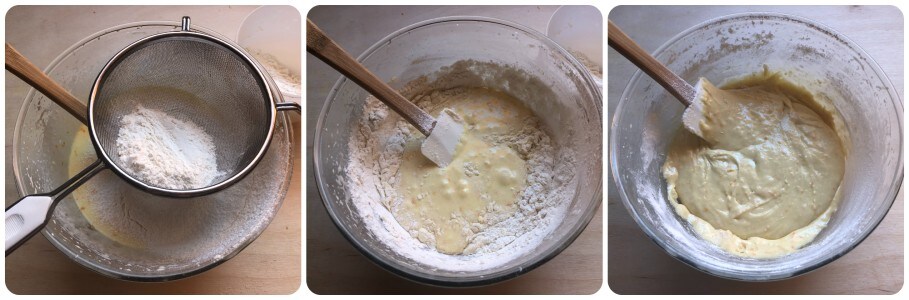 At this point, gradually add the flour and baking powder mixture, sifting it through a fine-meshed sieve. Also, add a pinch of salt and incorporate everything with the spatula.