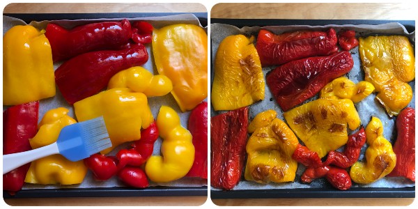 Then place them on a baking sheet lined with parchment paper. Brush them with a little oil and bake in a preheated oven at 400°F until they are soft and slightly charred. This will take about 40/45 minutes.