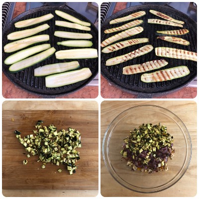 Finally, trim the zucchini, slice them about 1/8 inch thick, and grill them on the same griddle. Cut them into pieces and transfer them to the bowl.