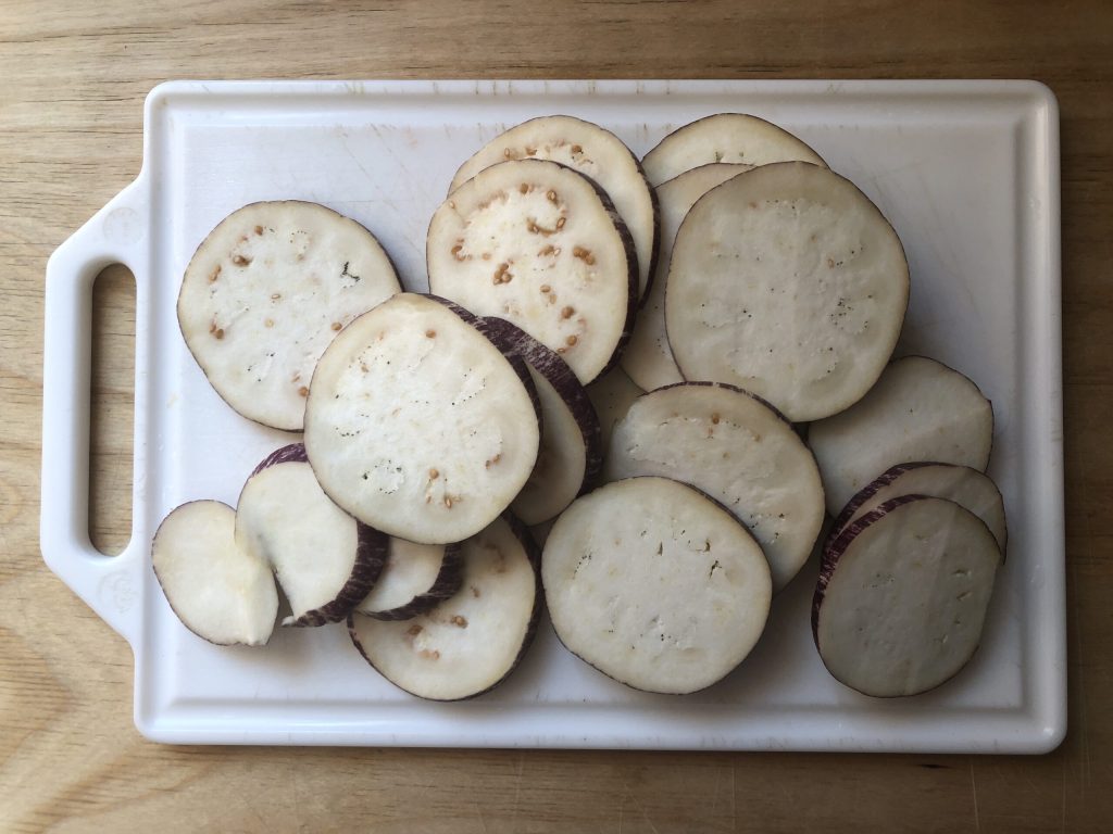 Trim the eggplant, wash it, and cut it into slices about 1/8 inch thick.